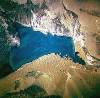 Bosten Lake (Chinese: 博斯騰湖; pinyin: Bósīténg Hú, Uyghur: باغراش كۆلى / Baghrash Köli/Baƣrax Kɵli) is a freshwater lake located on the northeastern rim of the Tarim Basin, about 20 km (12 mi) east of Yanqi and 57 km (35 mi) northeast of Korla, Xinjiang, China in the Bayin'gholin Mongol Autonomous Prefecture. Covering an area of about 1,000 km (390 sq mi) (together with adjacent small lakes), it is the largest lake in Xinjiang and one of the largest inland freshwater lakes in China.[1] Bosten lake receives water inflow from a catchment area of 56,000 km2 (22,000 sq mi).[2]