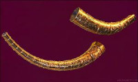 The Golden Horns of Gallehus were two horns made of sheet gold, discovered in Gallehus, north of Møgeltønder in Southern Jutland, Denmark. The horns date to the early 5th century, i.e. the beginning of the Germanic Iron Age.