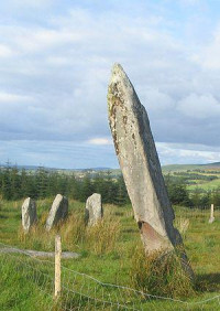 The Knocknakilla megalithic complex (Grid Ref: W297843) that lies between Macroom and Millstreet, in County Cork, Ireland. It is set in blanket peatland on the north-west upper slopes of Musherabeg mountain and is thought to be 3500 years old. The area is rich with archaeological artifacts, and nearby are two cashels, a ringfort, two fulacht fiadh, a possible souterrain and a circular enclosure.[2] The complex is best known for its large phallic and now leaning portal stone. Given the stones' relation to both the rising and setting sun, it is thought that they were aligned with purpose and functionality in mind, likely as calendars to early farmers,[3] probably related to harvest or fertility ceremonies.