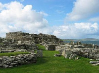 The Broch of Gurness is an Iron Age broch village on the northwest coast of Mainland Orkney in Scotland overlooking Eynhallow Sound, about 15 miles north-west of Kirkwall. It once housed a substantial community.
