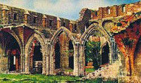 Bellapais Abbey, or "The Abbey of Peace" (from French: Abbaye de la Belle Paix), is the ruin of a monastery built by Canons Regular in the 13th century on the northern side of the small village of Bellapais, now in Turkish-controlled Northern Cyprus, about five kilometers from the town of Kyrenia. The ruin is at an altitude of 220m above sea level, and commands a long view down to Kyrenia and the Mediterranean sea.