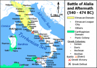 The naval Battle of Alalia took place between 540 BC and 535 BC off the coast of Corsica between Greeks and the allied Etruscans and Carthaginians. A Punic-Etruscan fleet of 120 ships defeated a Greek force of Phocean ships while emigrating to the western Mediterranean and the nearby colony of Alalia (now Aléria).